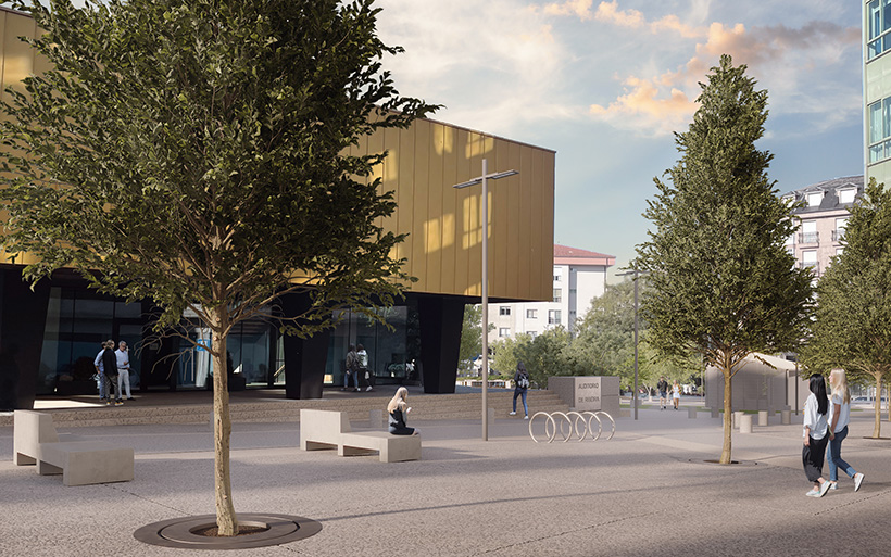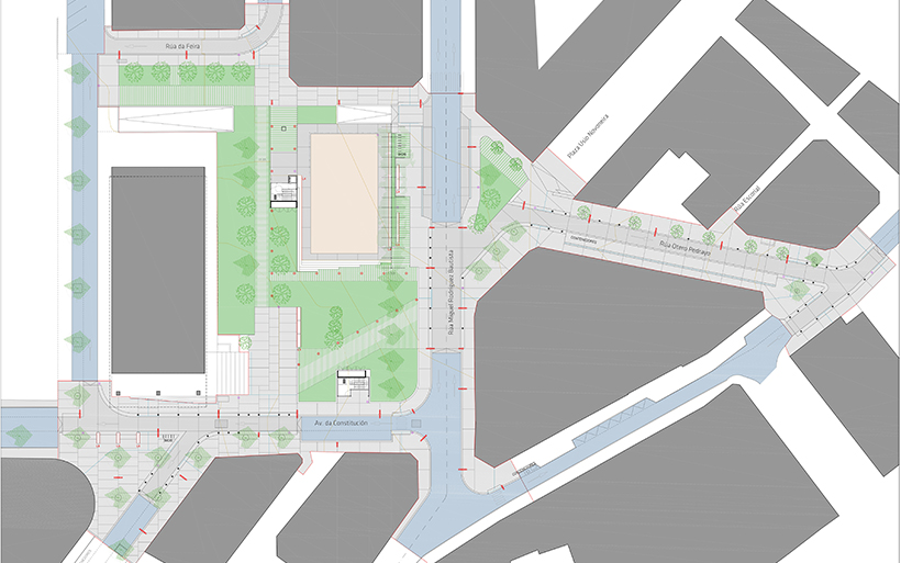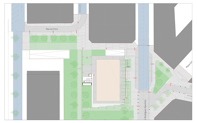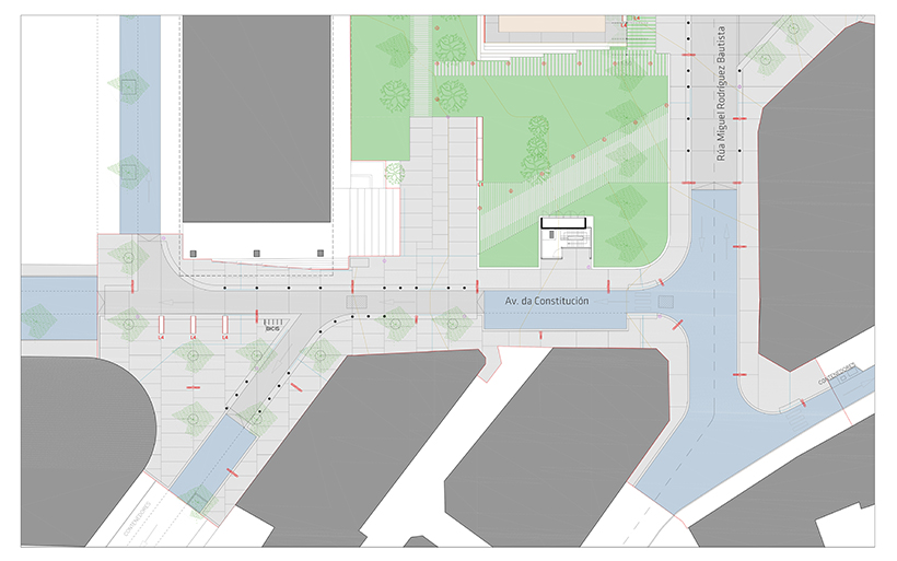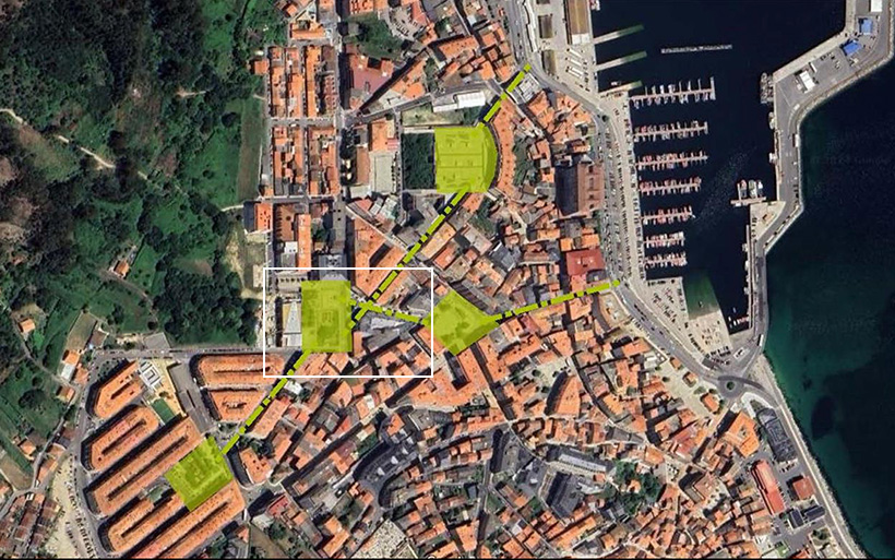 Esta plaza está situada en el centro de un recorrido que conecta el barrio residencial de Abesadas, el Auditorio Municipal, el edificio del Concello, el Mercado de abastos y el Paseo Marítimo. Además de canalizar los flujos de tráfico peatonal que conectan estos equipamientos, se trata de un espacio público que articula la conexión con otros espacios públicos relevantes y muy próximos, como son la Plaza de Abesadas, la Plaza del Concello, la Plaza de España y el Paseo Marítimo.