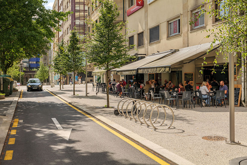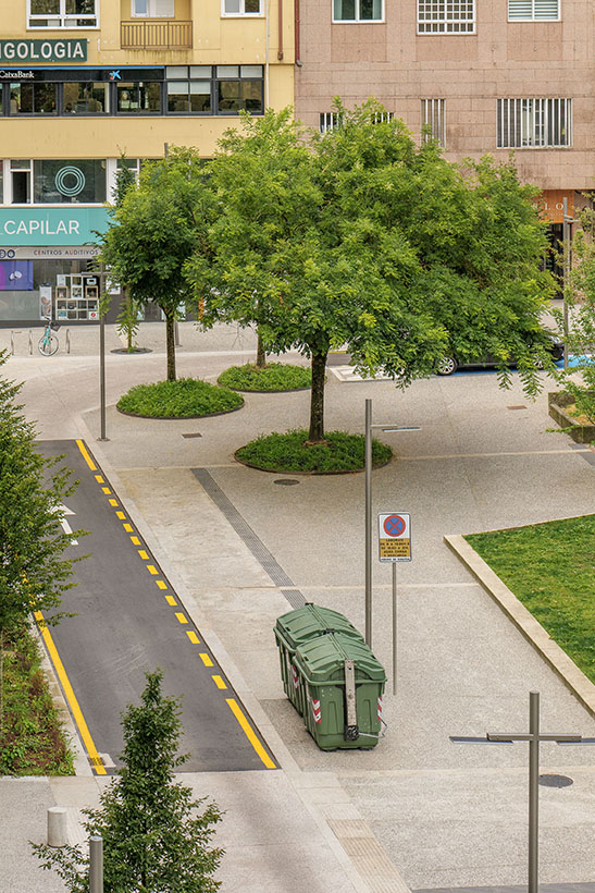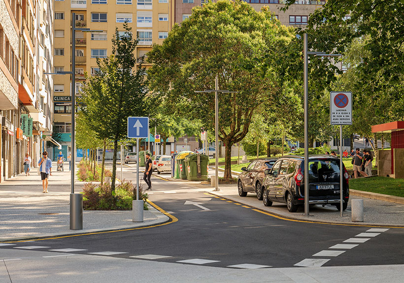 Las decisiones de restringir el tráfico a un solo carril, así como implantar el estacionamiento en superficie a un tiempo limitado, han sido decisivas para reducir la presión y las interferencias entre el perímetro y el centro de la plaza. La relación con el tráfico rodado se invierte de manera que la circulación peatonal adquiere prioridad.