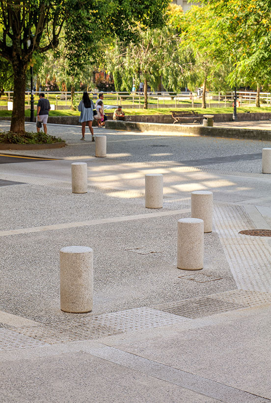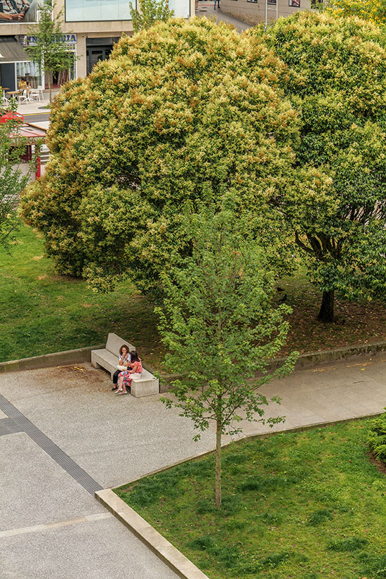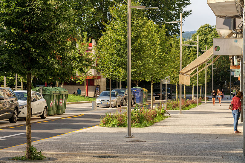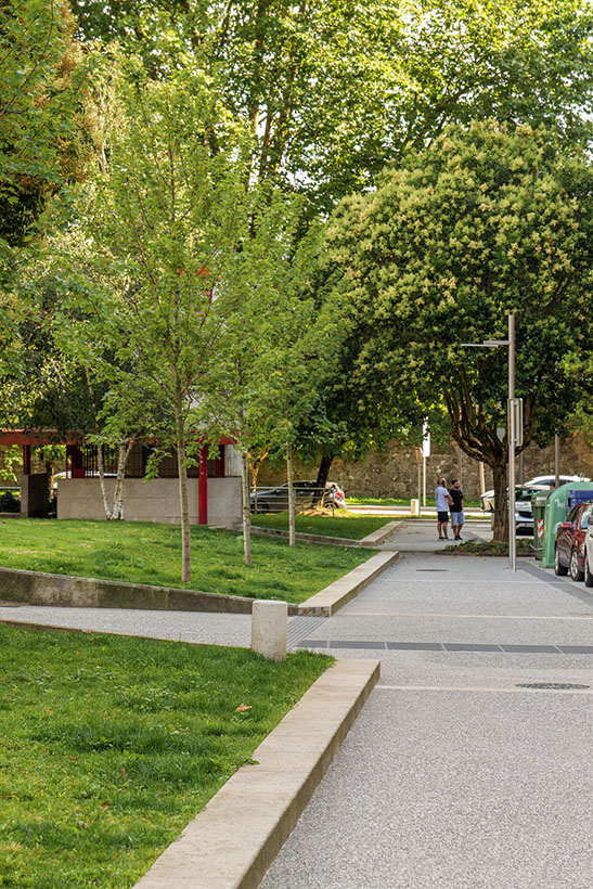 Especial interés tiene el esfuerzo de renaturalizar el espacio. Para ello se ha hecho una cuidada selección de los elementos existentes que convenía preservar. A ellos se han incorporado “carpintus acopado” y “arces fremanii”, emplazados de manera que permitan generar sombra sobre los recorridos peatonales. Así mismo se dispusieron alcorques corridos que facilitan la filtración del agua, y un mayor alojamiento para los árboles.