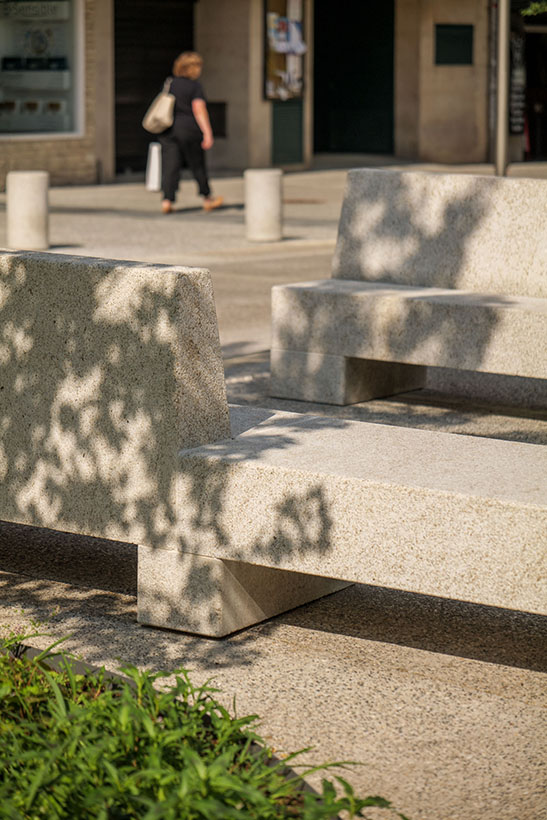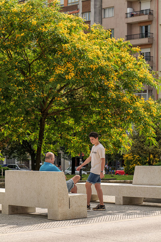 En cuanto a los materiales, la piedra, no siendo predominante, juega un papel fundamental en la ordenación y en la estructuración del espacio, ya sea marcando la modulación de los paños de hormigón que forman el grueso del pavimento, o a través de los elementos de mobiliario que organizan y diferencian espacios, tráficos y relaciones.